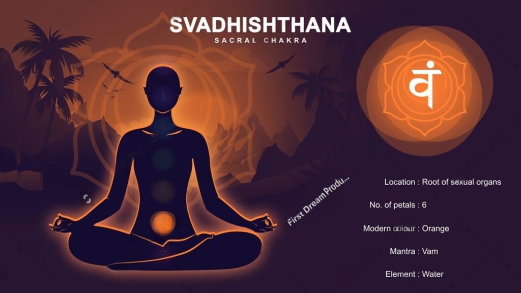 Located below the navel in the pelvic region, Swadhisthana governs the subtle water element (Apas Tattva), illustrating how emotions, like water, can either nourish or flood us.